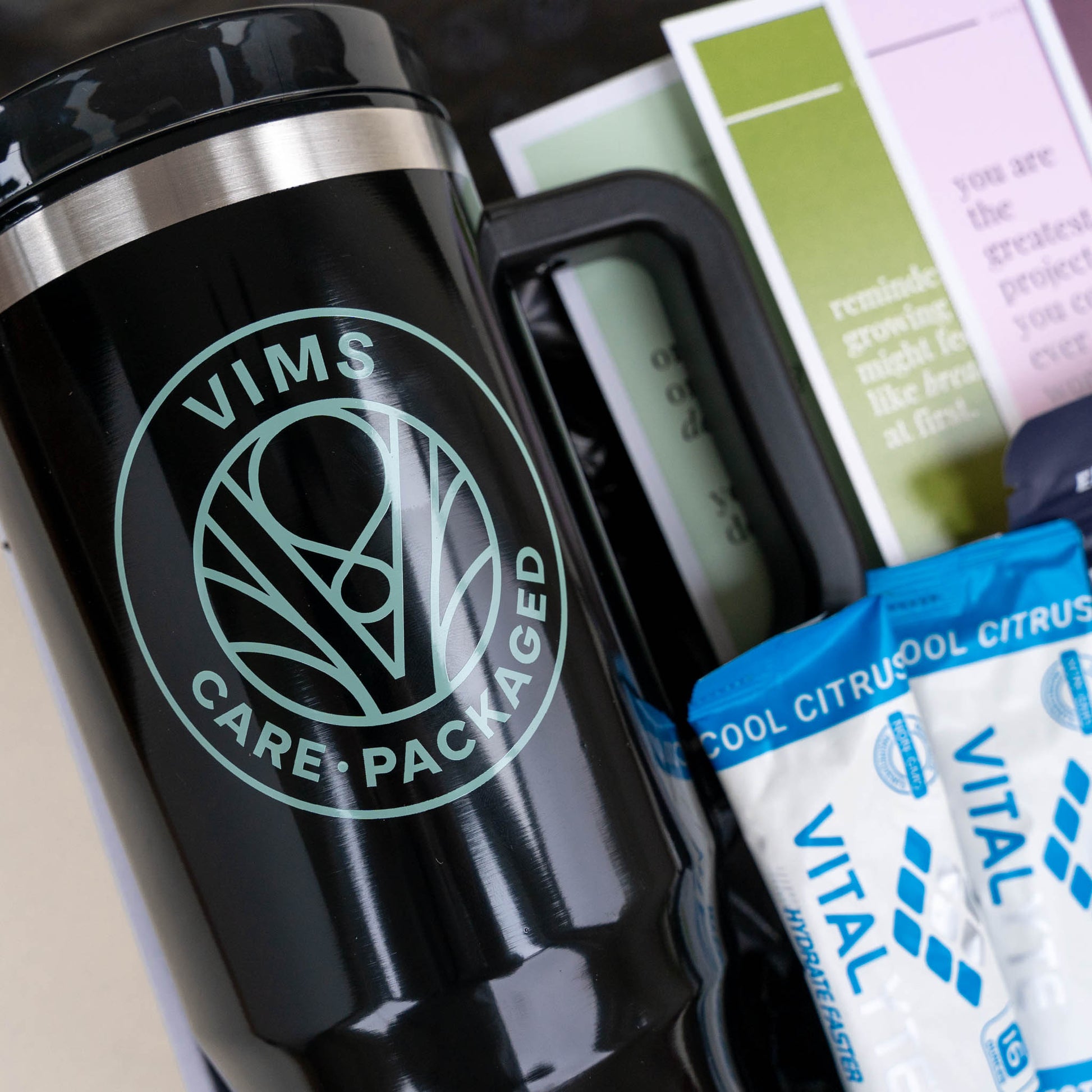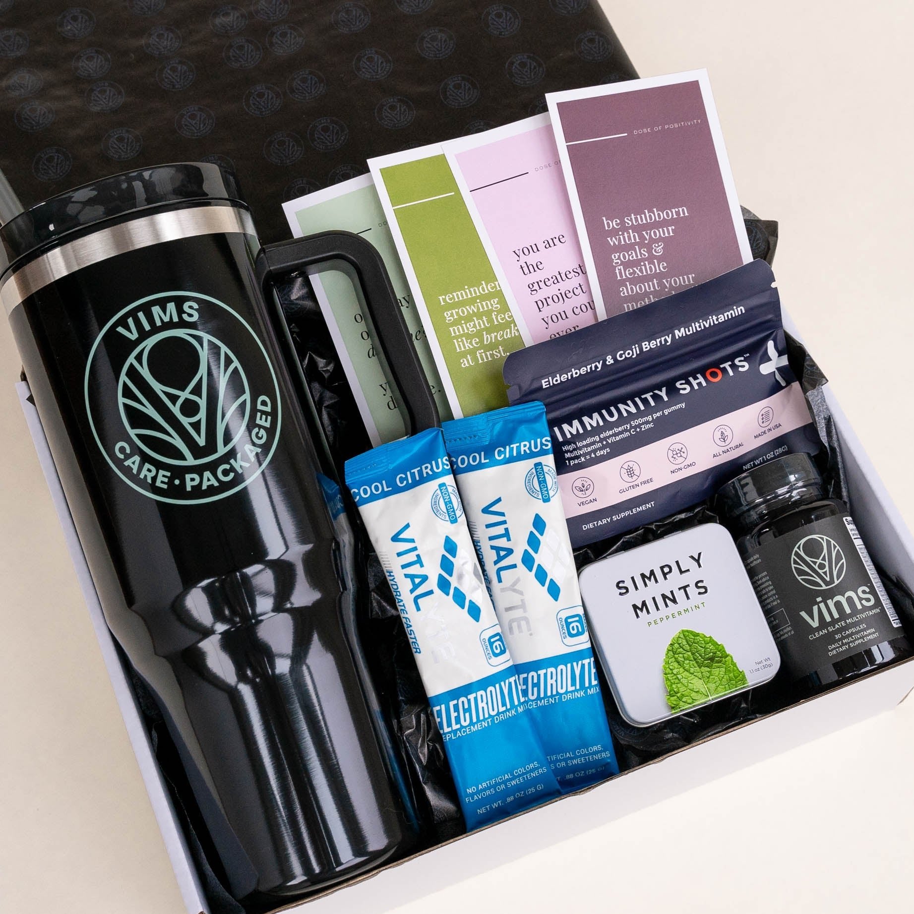 Our specialty vitamin and its "team"! What better way to send health and wellness than to give the vitamin that hones in on the specific needs of our Teens, College Students and Young Adults! We carefully paired our Clean Slate Multivitamin with the products we felt would support its purpose the best. All items in this box are geared toward staying healthy, hydrated and promoting one's best self! As always, our inspirational quote cards come in every VIMS Care Package to boost and inspire mental health.