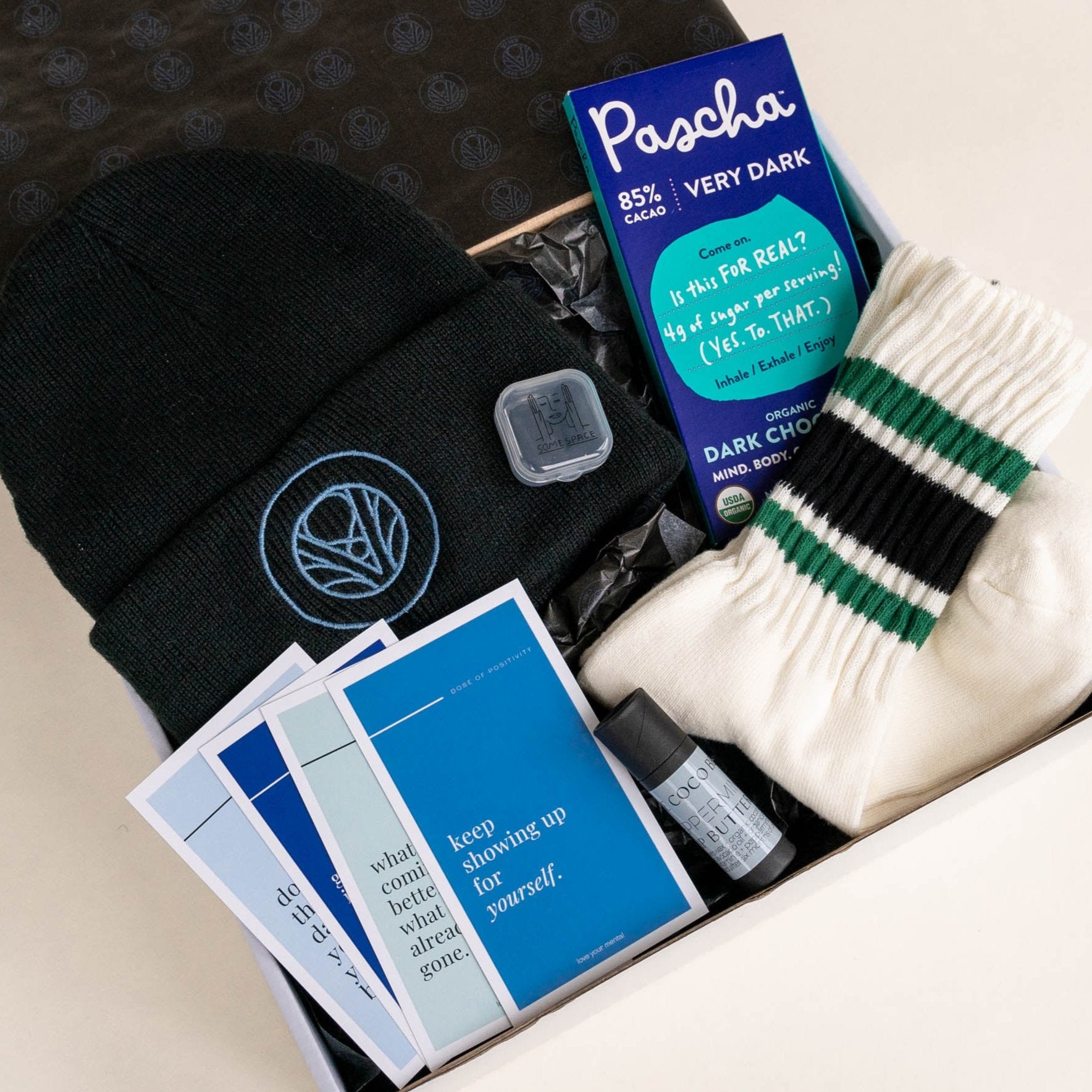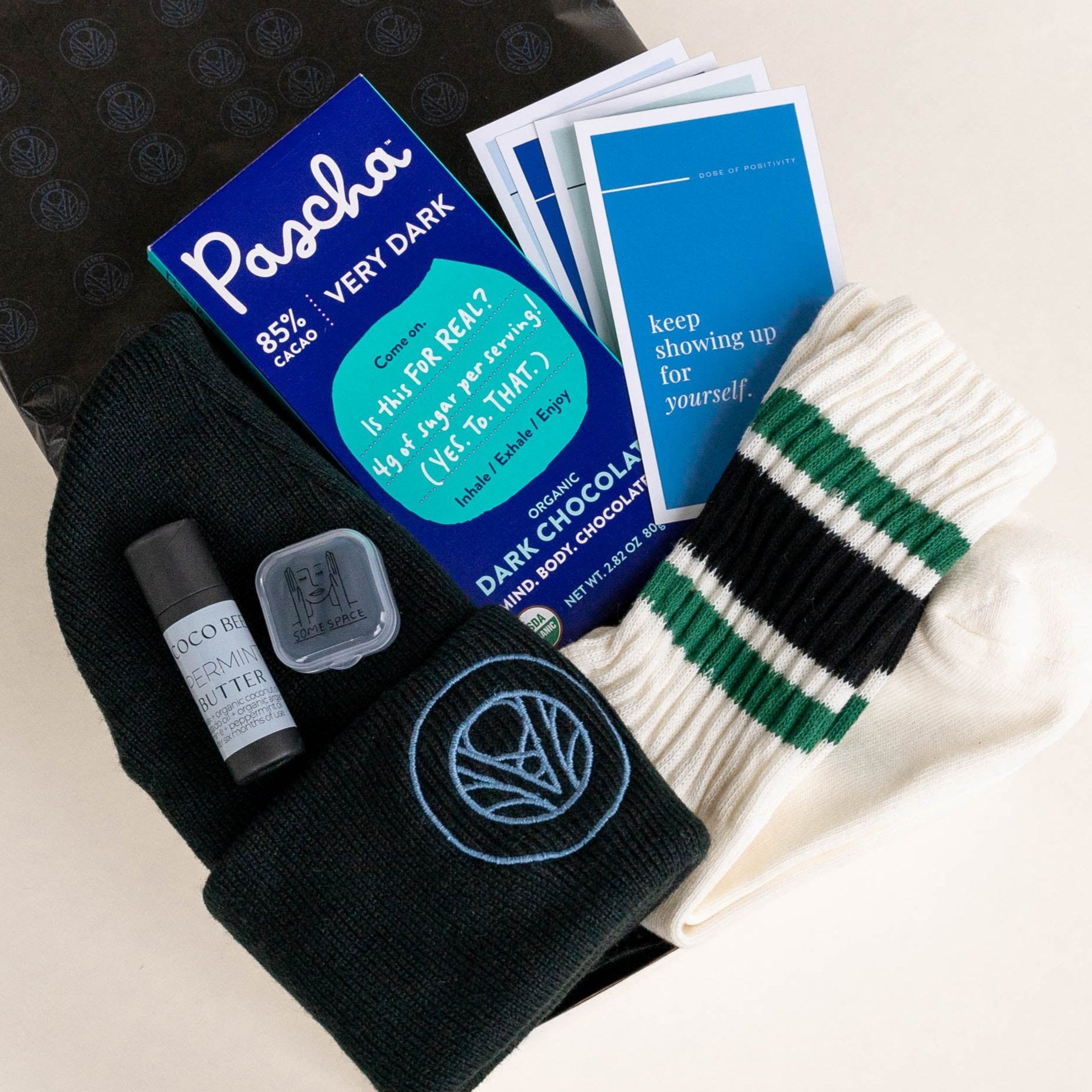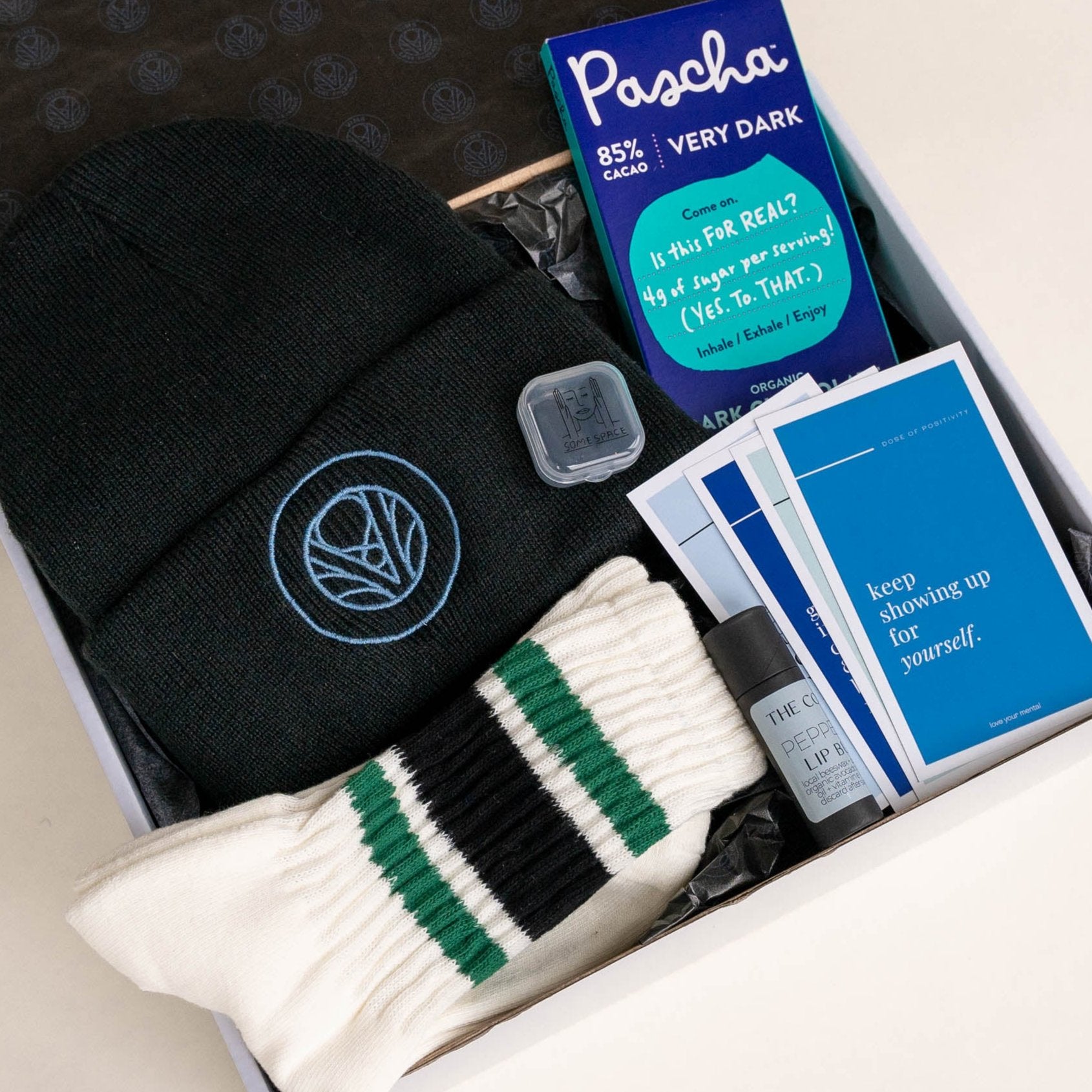 Snuggle up with our Winter themed box! Who doesn't need a beanie, socks and chocolate when it's chilly outside? The VIMS hat is a big hit among our outdoorsy customers - cozy and fashionable! Rounding out the care package is a hand-crafted lip butter that is a must have this winter season! As always, our inspirational quote cards come in every VIMS Care Package to boost and inspire mental health.